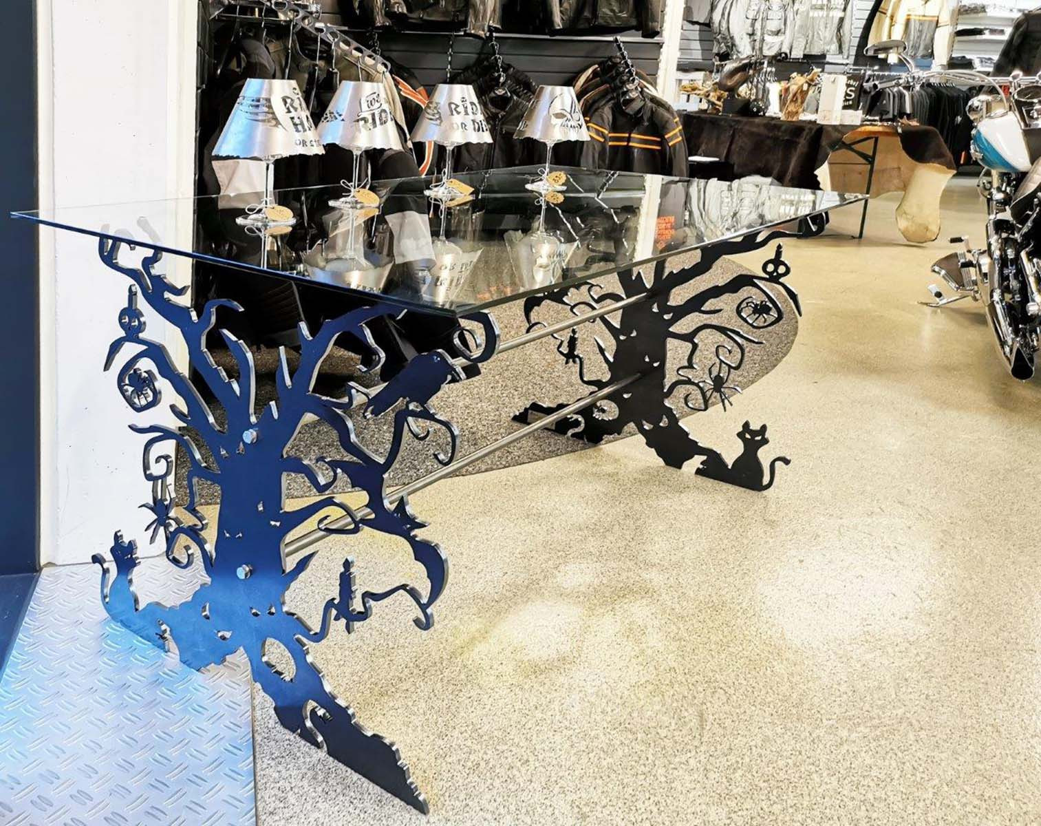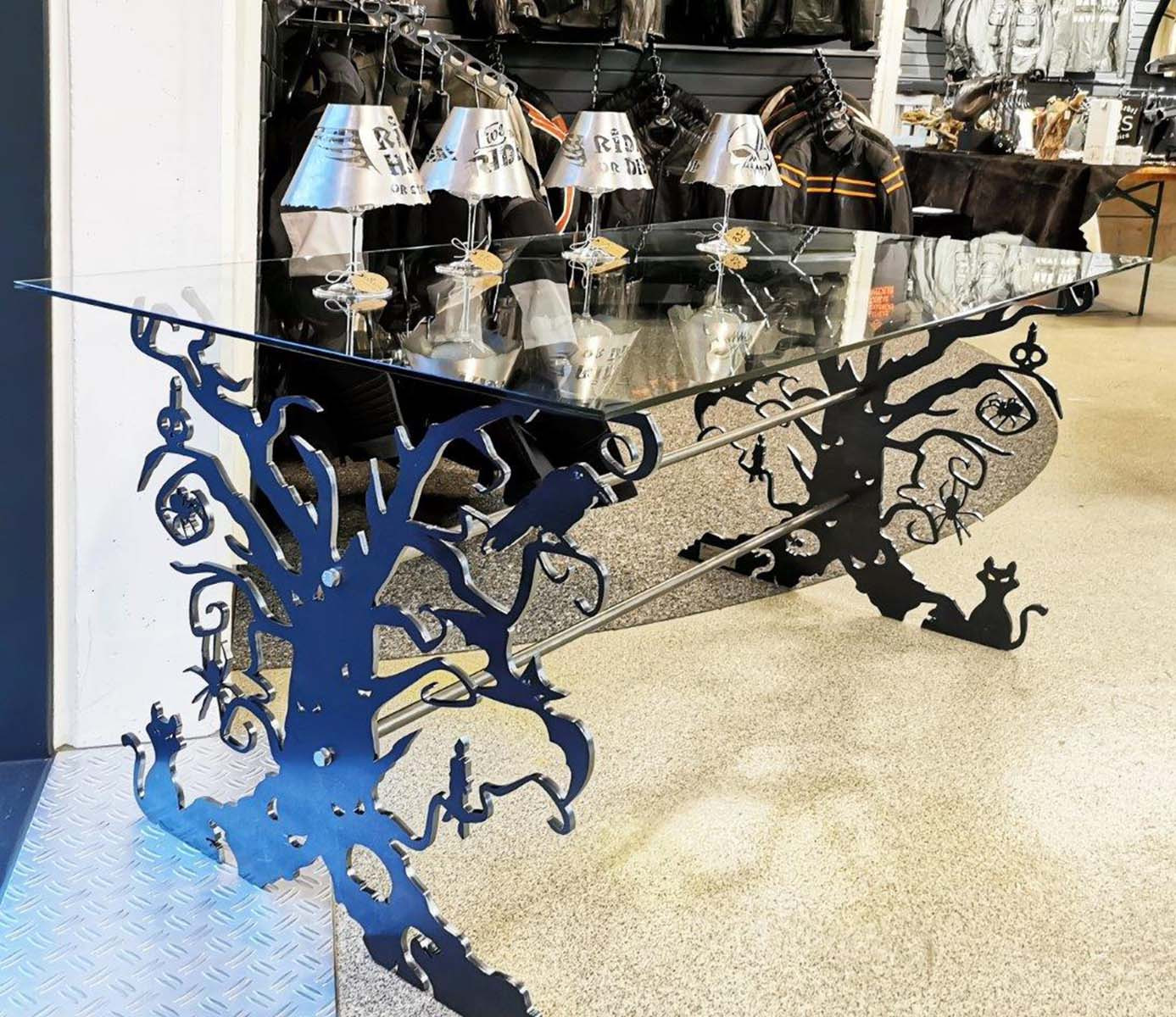 Tischfuss aus 5mm Designblech mit 8mm Glasplatte