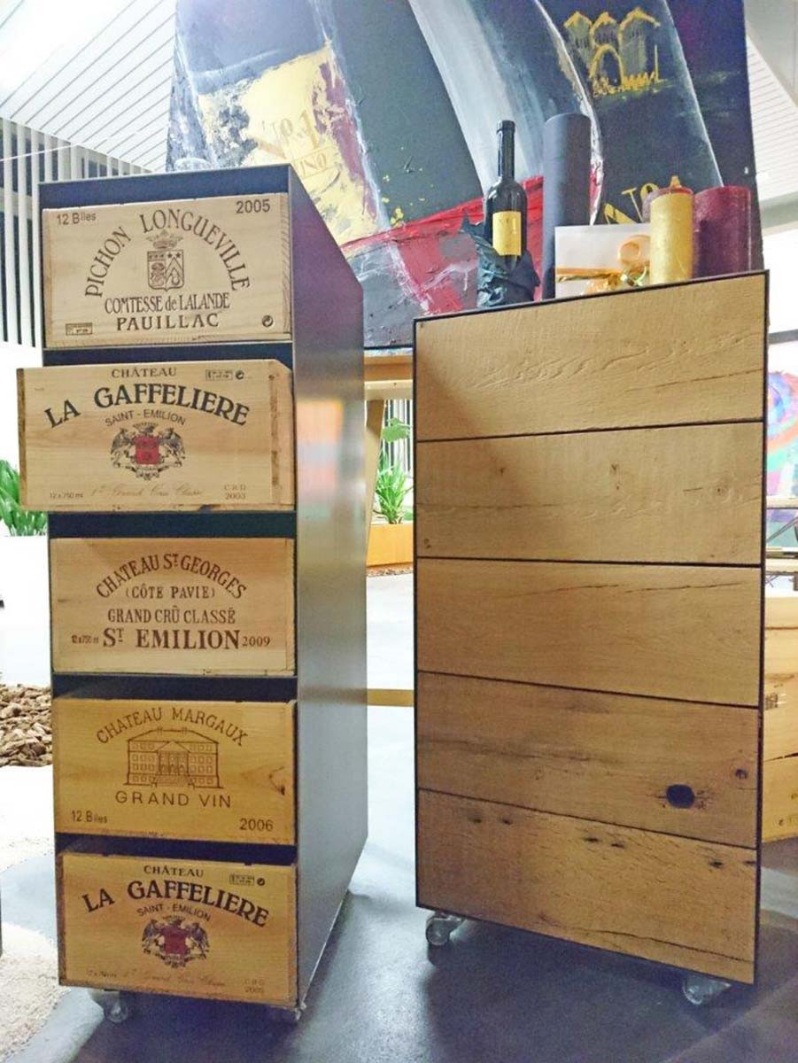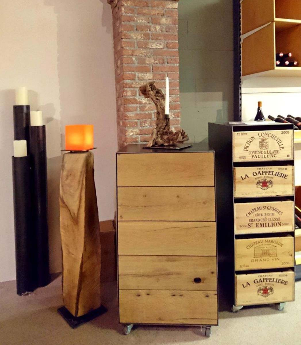 Rohstahlbox auf Rollen mit Eichenholz- und Weinkisten-Schulbladen