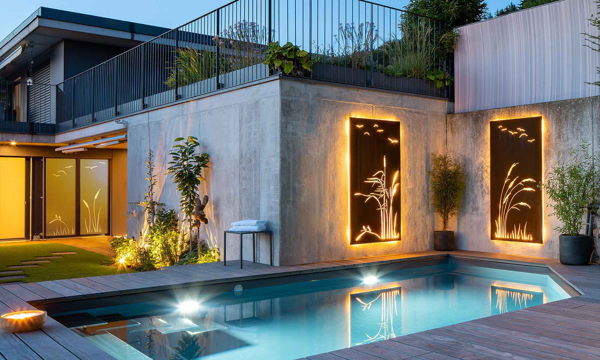 MURO Wandbild aus 2 mm Cortenstahl und Outdoor LED Beleuchtung