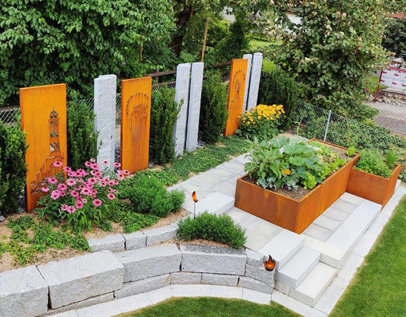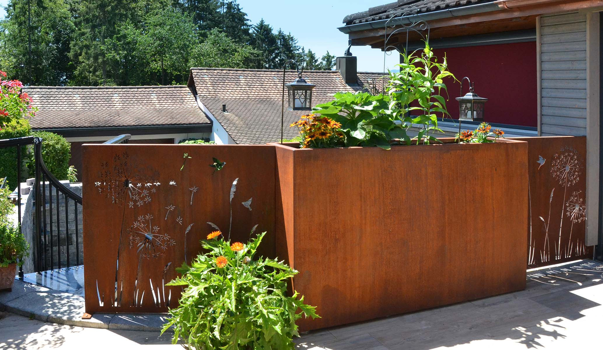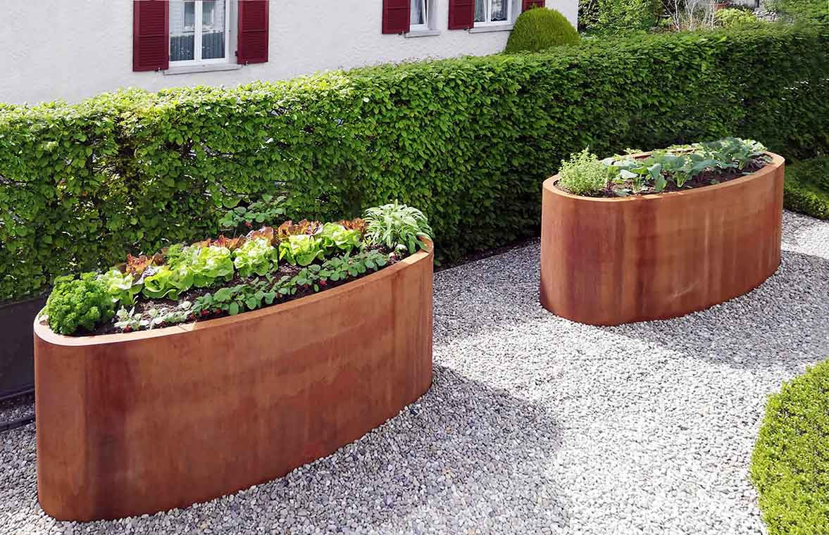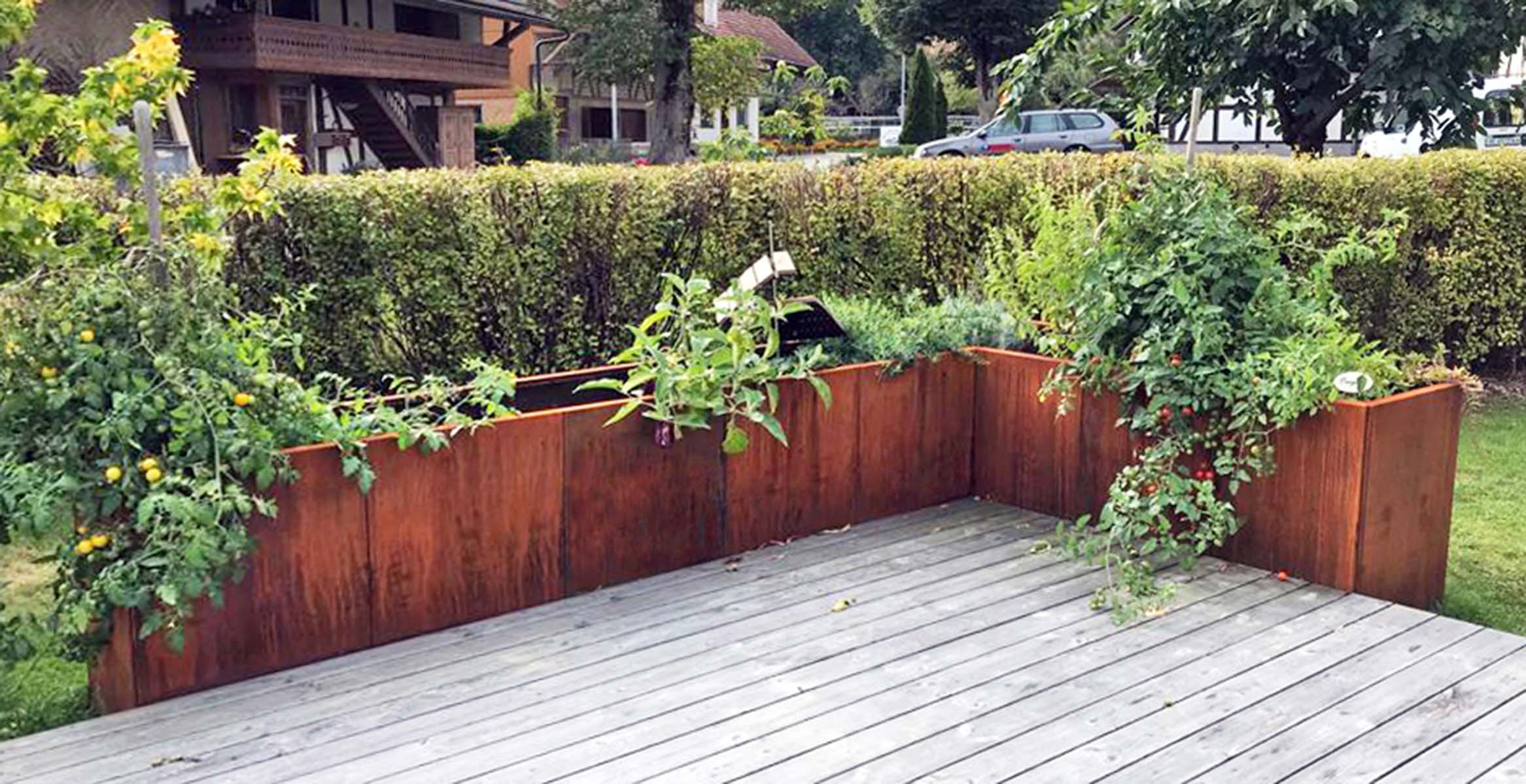 Pflanzgefässe und Hochbeete sind in zwei Konstruktionsvarianten zu haben: fix verschweisst oder modular zusammenschraubbare Seiten- und Eck-Elemente, die individuell kombiniert werden können. Bei Bedarf mit wasserdichtem Boden und 10cm Überlaufrohr für Drainage lieferbar. Für grosse Erdstützelemente und Fassaden-verblendungen können neu Formate bis zu sechs Meter gelasert und verarbeitet werden.