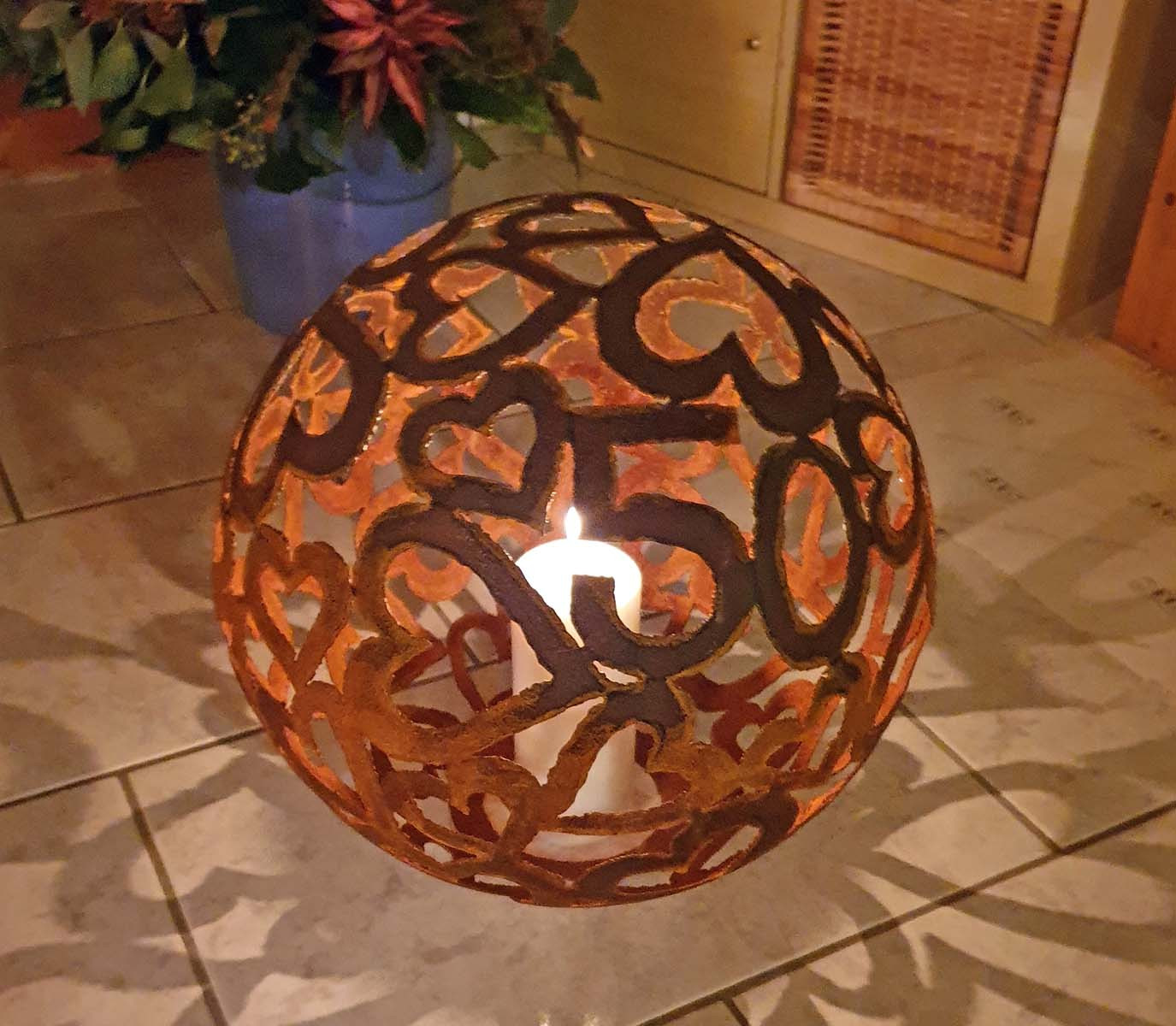 Wenn Sie unten ein Loch in die Deko-Kugel machen lassen, können Sie diese auf eine Lampe oder eine Kerze stellen und die Kugel wird von innen her ausgeleuchtet.